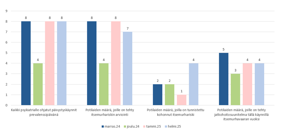 Kuva: Psykiatrian päivystyskäynnit, itsemurhariskin arviointi, kohonnneen itsemurhariskin tunnistaminen ja jatkotoimenpiteet Psykiatrian akuuttityöryhmässä 11/2024-02/2025.