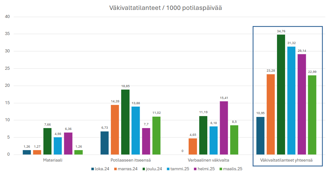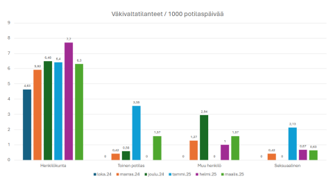 Kuva 1. Väkivaltatapahtumien esiintyminen psykiatrian vuodeosastoilla 10/2024–03/2025. Yksi väkivaltatilanne voi sisältää useamman väkivallan tyypin. Katso kuva suurempana klikkaamalla tästä.