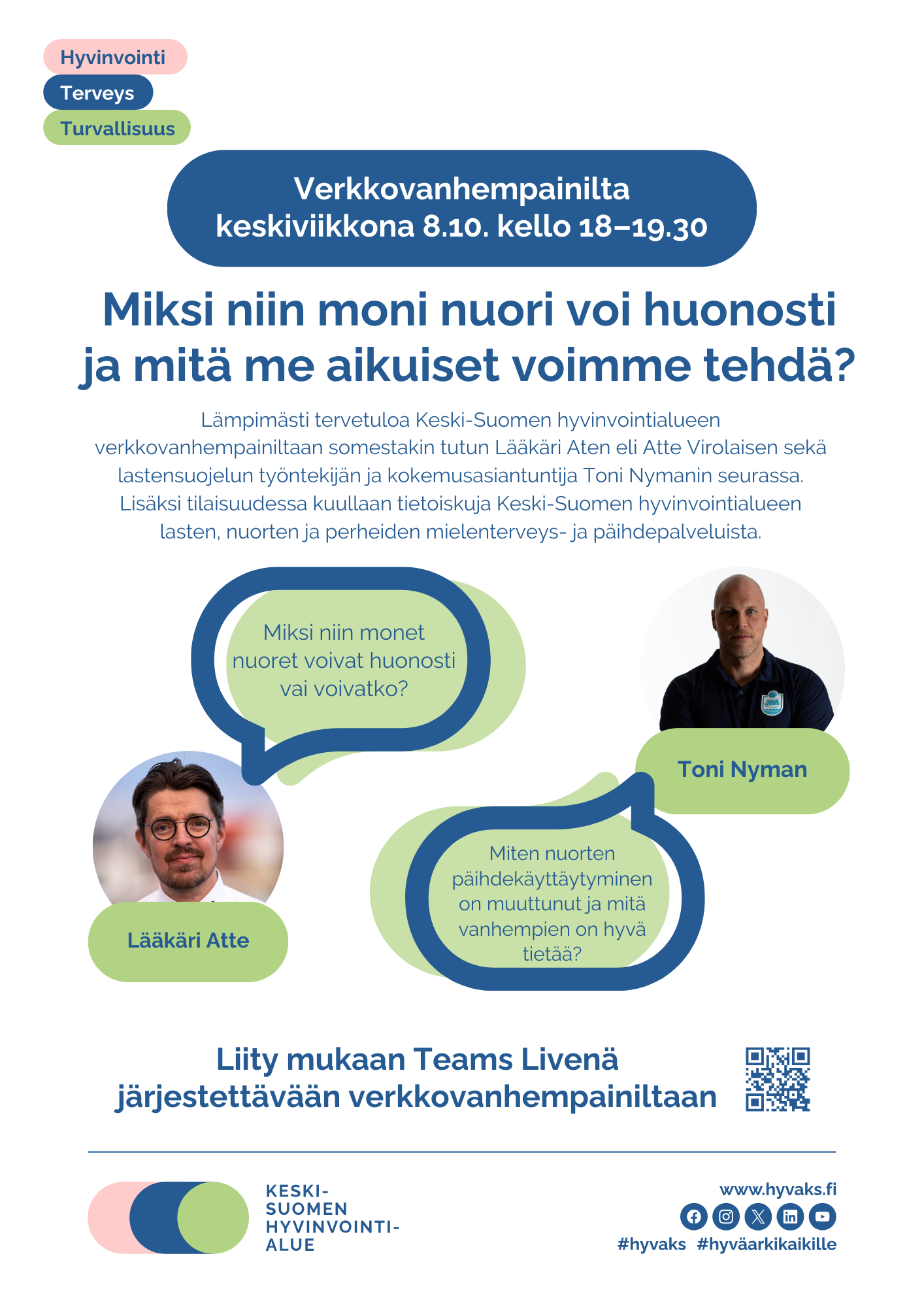 Viestintäpalvelut vastaavat median yhteydenottoihin. Tuotamme ajankohtaisia kuva- ja viestintämateriaaleja kumppaneidemme käyttöön. Keski-Suomen hyvinvointialueen brändin mukainen äänensävy on avoin ja valoisa – puhumme ihmiseltä ihmiselle selkeästi ja ymmärrettävästi. Äänensävyssämme kuuluu myös maalaisjärki.